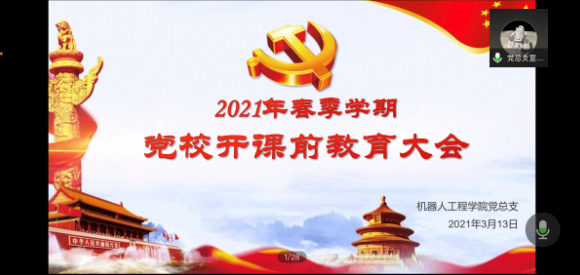 3月13日,机器人工程学院党总支通过腾讯会议平台组织召开了2021年春季学期党校开课前教育大会,2021年春季学期入党积极分子培训班学员参加大会,大会由党总支宣传委员王泽鹏主持。
