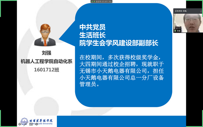 现就职于美的集团无锡小天鹅电器有限公司的1601712班刘强同学分享了自己的就业经历,详细介绍了所在企业各岗位的工作内容、薪资待遇及发展前景,使学生家长更加了解了我校校企合作单位的具体情况。