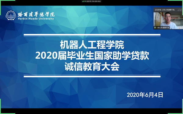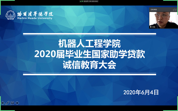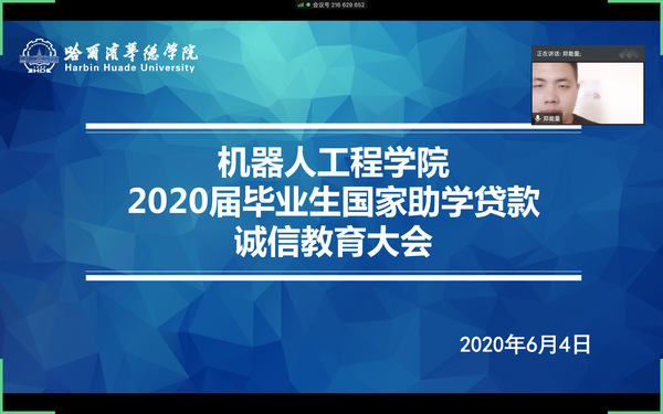 由于疫情影响,为切实降低因人员聚集造成的疫情防控风险,保障广大师生人身安全,2020年度黑龙江省国家助学贷款毕业生还款确认工作全部授权高校进行确认。为进一步提高国家助学贷款毕业生的诚信意识,强化资助育人效果,推动我院国家助学贷款工作的持续健康发展。6月4日下午我院通过腾讯会议平台开展了机器人工程学院2020届毕业生国家助学贷款诚信教育大会。会议由2016级辅导员郑义主持,副院长刘张、团总支书记刘存艳以及2020届贷款学生参会。