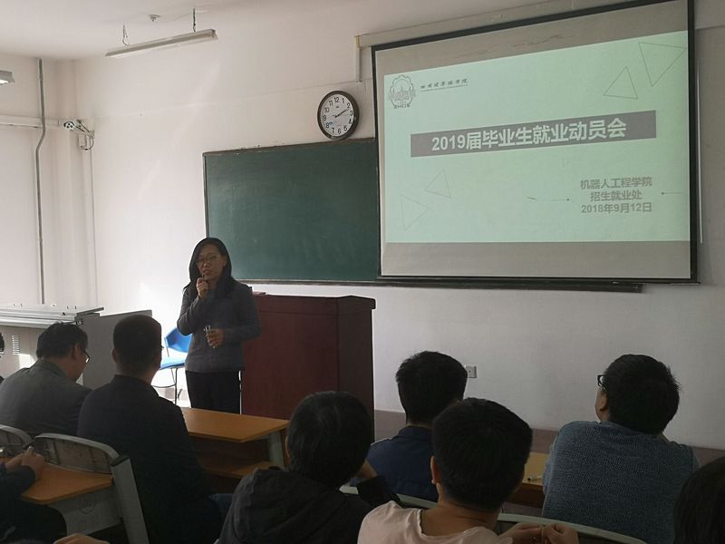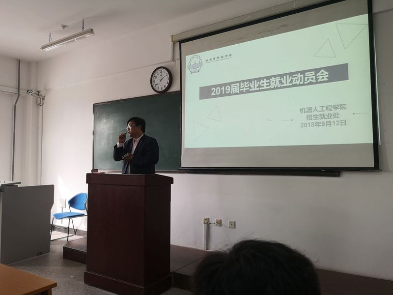 9月12日下午13:45机器人工程学院在教五206召开了2019届毕业生就业动员大会。副校长顾鹂鸣、招生就业处就业指导中心主任张有承、机器人工程学院副院长王振力、机器人工程学院19届毕业生辅导员王韩笑以及机器人工程学院2015级全体学生参加本次会议。