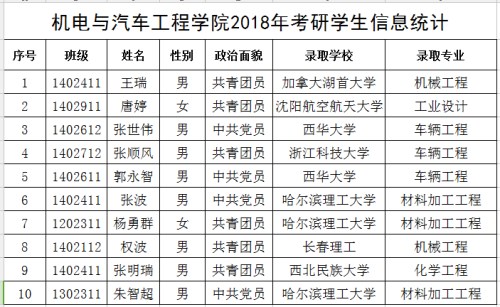 随着2018年考研成绩的火热出炉,我校考研学子捷报频传。近日,机电与汽车工程学院传来喜报,学院立志成才班中王瑞、张世伟、张顺风、唐婷等10名同学分别考取加拿大湖首大学、西华大学、浙江科技大学、沈阳航空航天大学等国内外高校硕士研究生。经初步统计,拟报考2019年硕士研究生人数55人,目前学生正在积极备考中。
