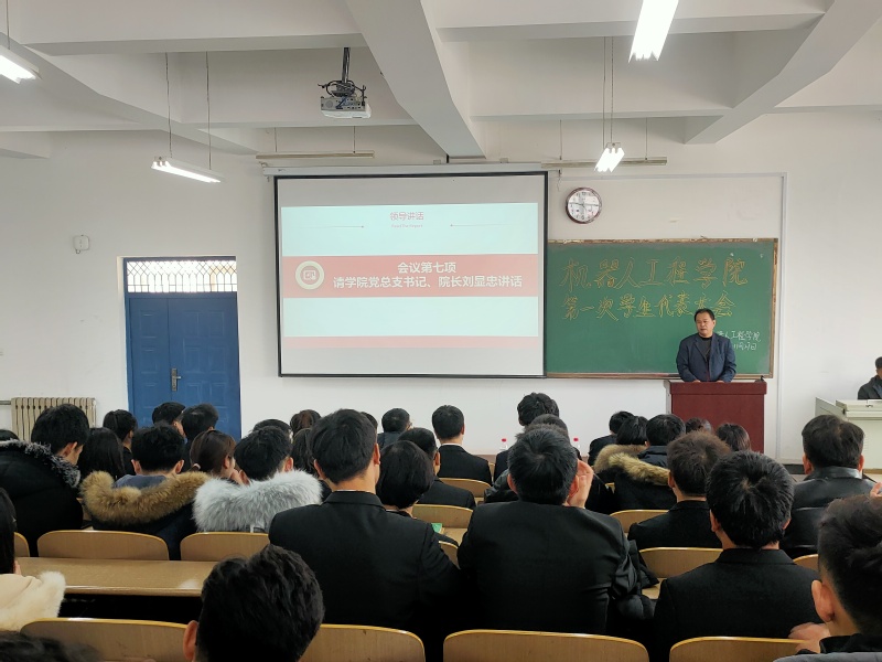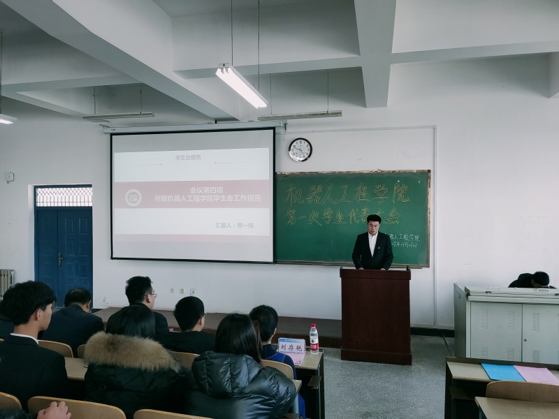 2019年11月27日中午11点40分机器人工程学院第一次学生代表大会在教五101隆重举行。院党总支书记刘显忠、党总支副书记刘张、校团委组织部部长刘守佳、院团总支书记刘存艳、学院全体辅导员及院第三届学生会主席团代表参加活动。院团总支书记刘存艳老师主持会议。