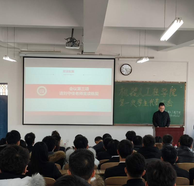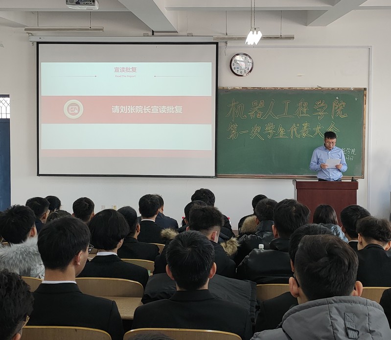 校团委组织部部长刘守佳老师宣读校团委《关于同意召开机器人工程学院第一次学生代表大会的批复》