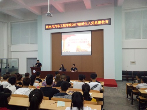 为使2017级新生对党组织有进一步的了解、认识,树立崇高理想,明确努力方向,适应大学生活。9月6日下午14:30机电与汽车工程学院党总支在第一教学楼J501学生活动中心开展机电与汽车工程学院开展2017级新生入学教育活动——入党启蒙教育讲座。校党群工作部部长魏可霏、机电学院党总支副书记付洪涛、组织委员赵强、宣传委员侯瑞贺、机电学院第一学生党支部组织委员姚飞出席本次讲座,学院全体2017级新生参加本次讲座。