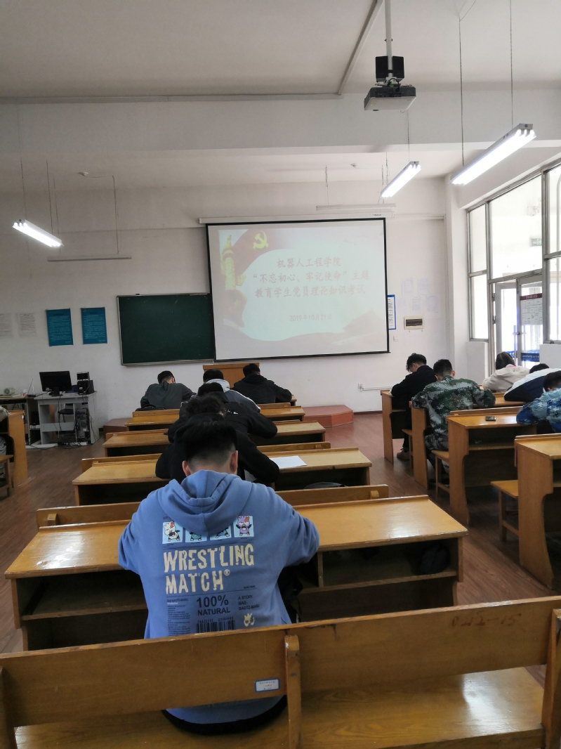为全面检验“不忘初心、牢记使命”主题教育集中学习成效,增强党员树牢“四个意识”、坚定“四个自信”、做到“两个维护”的思想自觉和行动自觉。10月21日中午,机器人工程学院学生党支部在教六107教室举行“不忘初心、牢记使命”主题教育知识考试。20名学生党员参加考试。