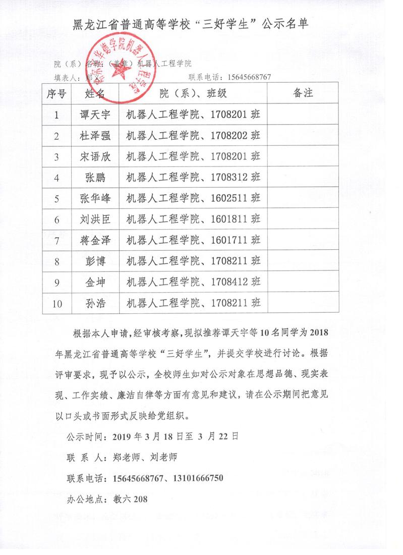 机器人工程学院黑龙江省普通高等学校“三好学生”公示名单