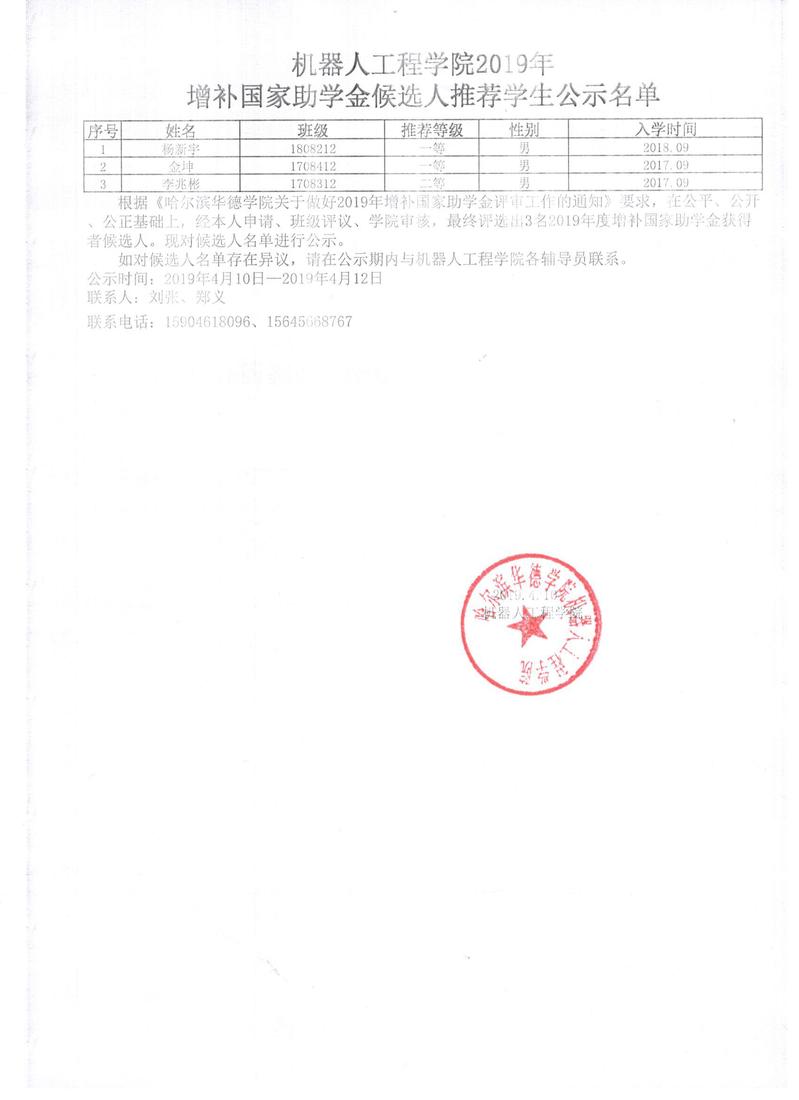 机器人工程学院2019年增补国家助学金候选人推荐学生公示名单