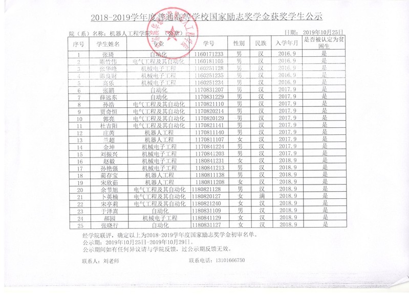机器人工程学院2018-2019学年度普通高等学校国家励志奖学金获奖学生公示