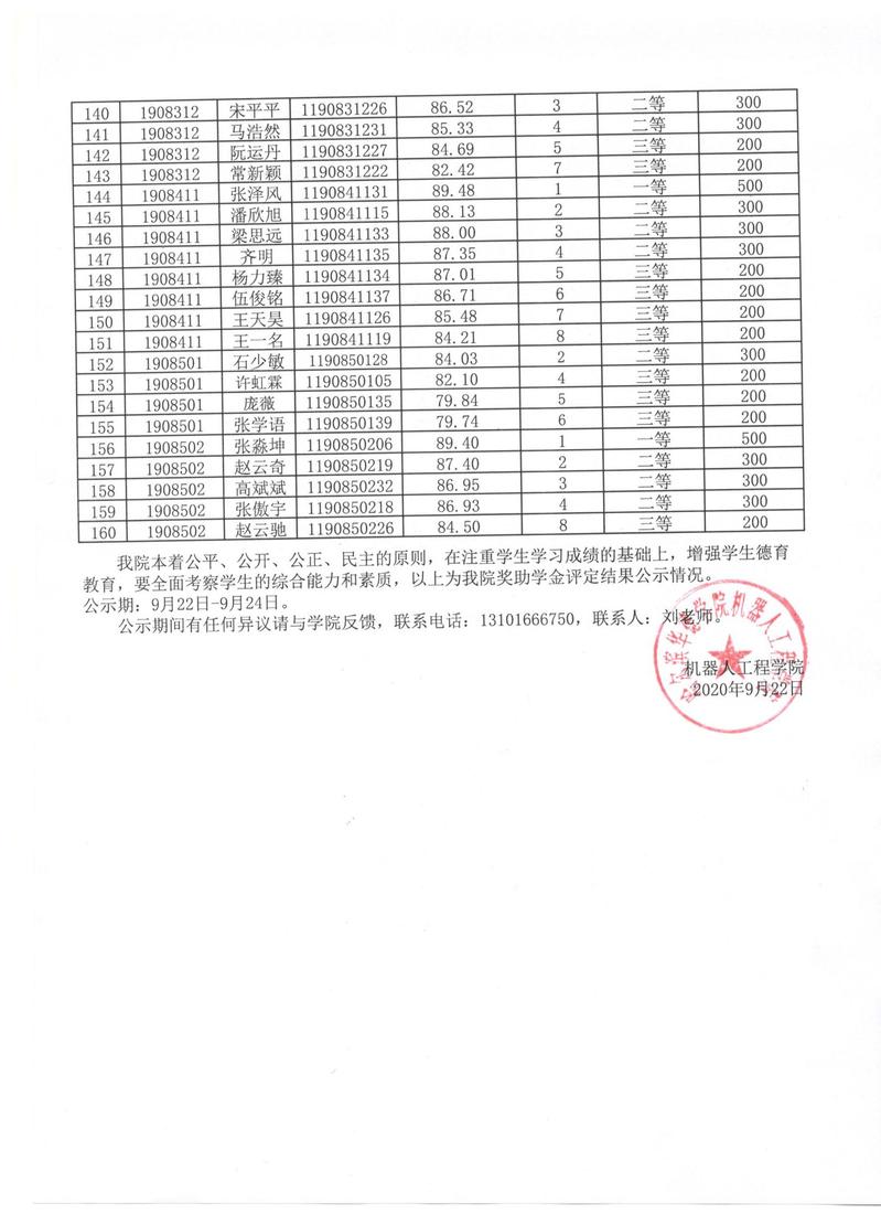 机器人工程学院2019-2020学年度第一学期学校奖助学金公示