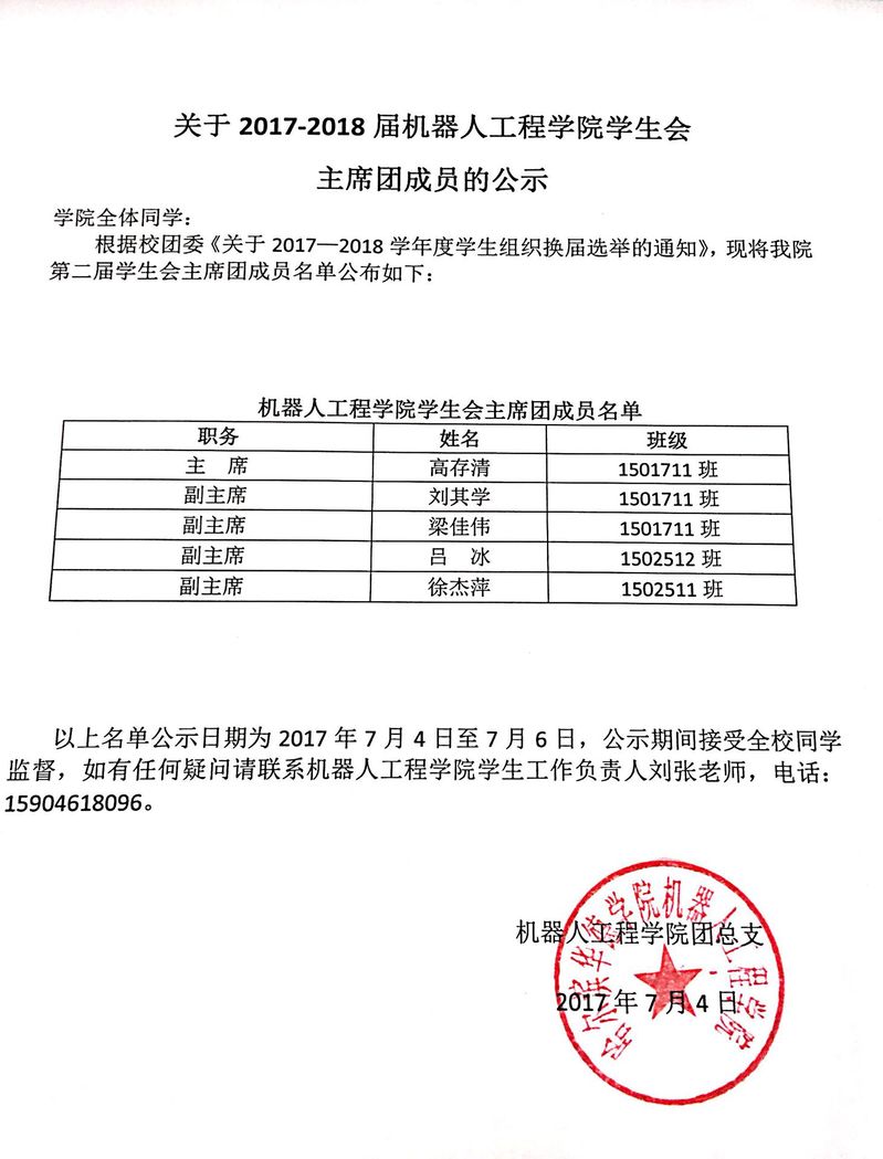 关于2017-2018届机器人工程学院学生会主席团成员的公示