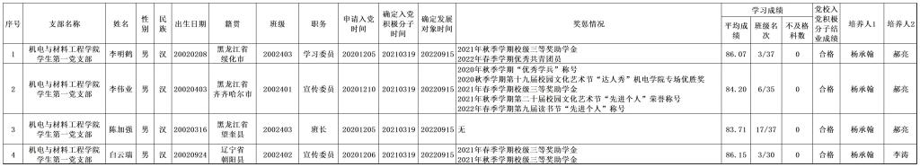 经机电与材料工程学院学生第一党支部委员会讨论,报机电与材料工程学院党总支备案同意,将李明鹤等4名同志列为发展对象。根据发展党员工作有关要求,现将有关情况公示如下:
