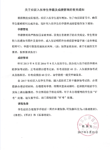关于应征入伍学生学籍及学习成绩管理的有关通知
