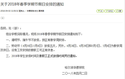 关于2018年春季学期节假日安排的通知