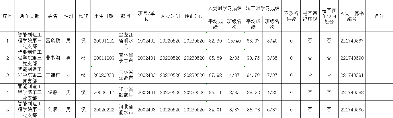 在听取党员和群众意见的基础上,经党支部委员会审查,拟将雷欣鹏等5名同志转为中共正式党员。根据发展党员工作有关要求,现将有关情况公示如下: