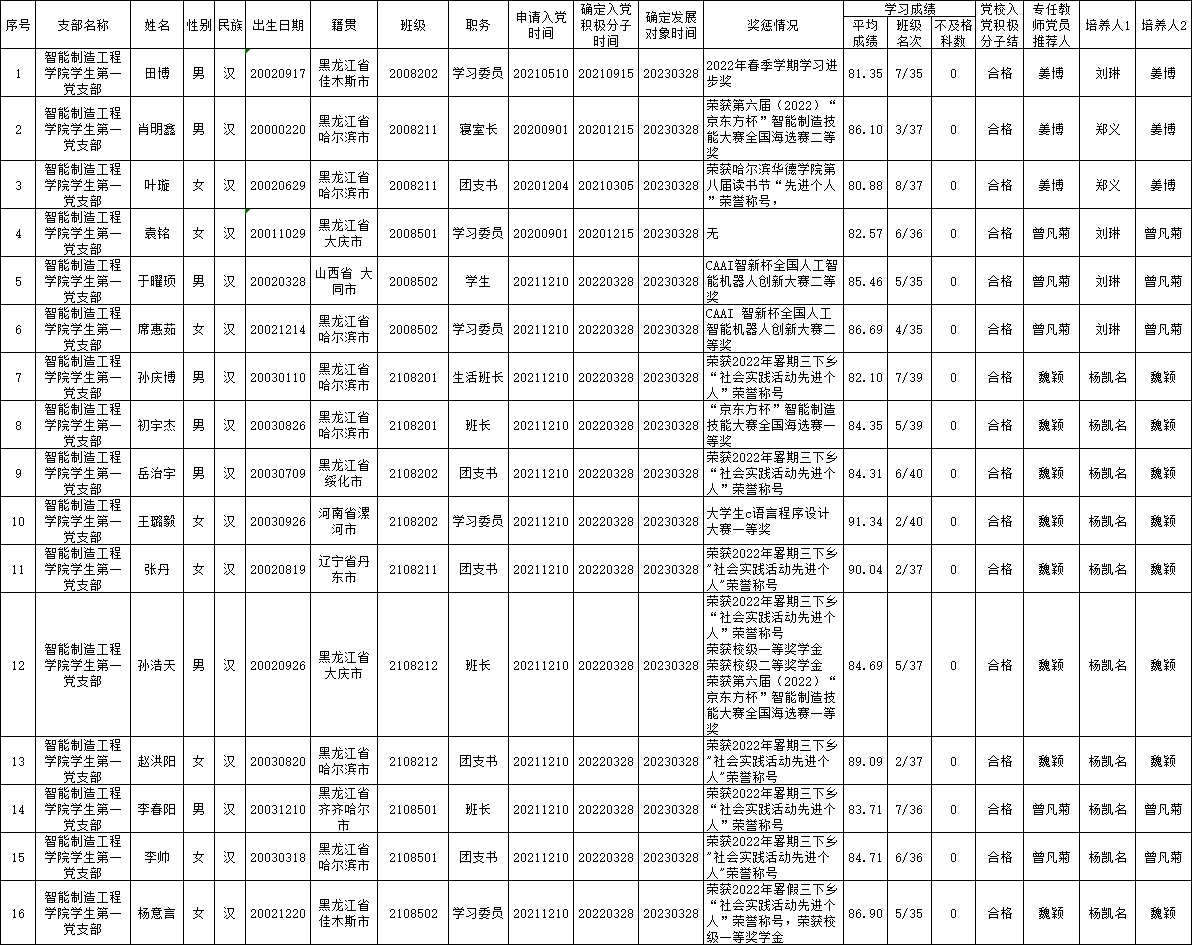 经pg娱乐电子游戏官网入口学生第一党支部委员会讨论,报智能制造工程学院党总支备案同意,将田博等16名同志列为发展对象。根据发展党员工作有关要求,现将有关情况公示如下: