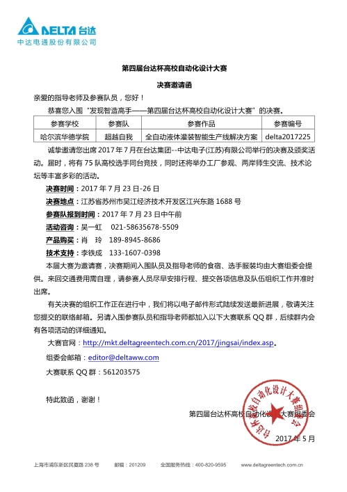 第四届“台达杯”高校自动化设计大赛是面向全国大学生(包括台湾省)大学生的创新性科技竞赛活动,本届大赛部分东南亚国家的大学也派队伍参加。本次大赛以“发现智造高手”为主题,结合台达自动化技术与产品,面向全日制高等院校在校生征集自动化系统创新设计方案。“台达杯”高校自动化设计大赛,每年一次,是由教育部高等学校自动化类专业教学指导委员会、中国自动化学会、工业与信息化职业教育教学指导委员会、自动化专业指导委员会主办,台达集团承办的自动化应用领域的创新型科技竞赛。旨在贯彻落实教育部关于教育教学改革精神,搭建高校自动化教学交流平台和大学生社会实践平台。