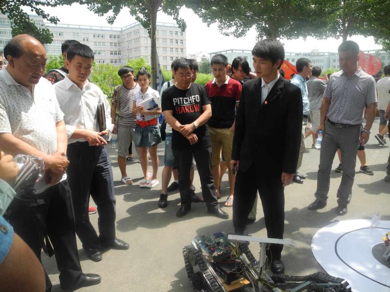 本次参展作品共设作品展区和图片展区两部分,其中在作品展区,一件件由分院焊接技术社团、零点实验室、CAD社团、机械创新实验室等十个优秀社团制作的,共有300余件作品进行参展。其中不乏分院学生自主研制并获得国家新型实用专利的作品,如智能大棚管理系统、智能邮件分拣系统、智能超市和旋转LED显示屏。在本展区,最为耀眼的是分院学生刚刚制作完成的铁艺机器人“中国梦战士”,此作品2.56米高,由分院吴犇、李玉龙两位教师技术指导,分院焊接技术社团制作,汽车涂装社团协助历时二个月的时间在母校22华诞之际制作完成,谨以此献给母校,恭祝母校生日快乐。活动中,分院学生还向现场领导、老师演示基于SPM32四轴飞行器,太阳能除草车、太阳能清洁车等多项学生成果,得到校领导好评。