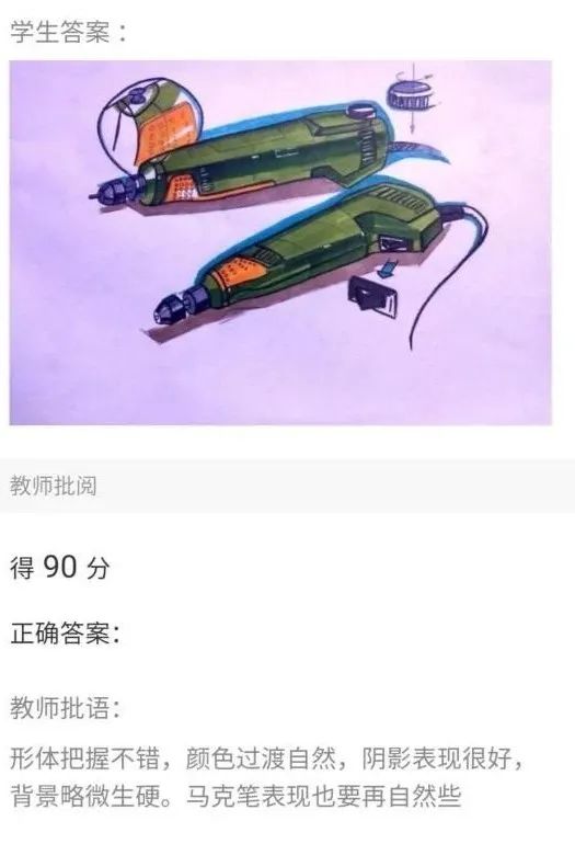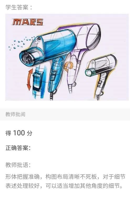 同时,依托学习通平台对学生作业进行在线点评。通过教学演示及学生动手实践教、学结合,即便是没有美术功底的同学也能够熟练掌握产品设计手绘表现的技法,充分体现了实验实训课程的教学效果。
