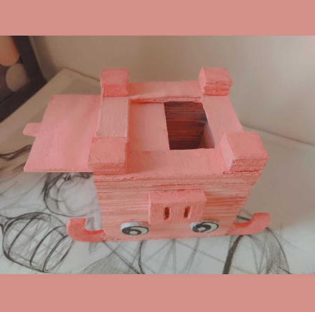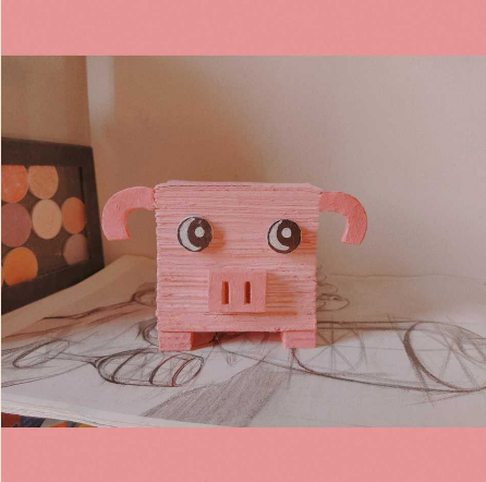 1702911班顾子琦同学作品:利用近100张便签纸通过断层裁切黏贴的方式,模拟LOM成型技术制作的小猪存钱罐,不仅造型可爱,还具备滑盖功能。