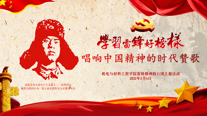 在第58个“学雷锋纪念日”暨第22个中国青年志愿者服务日来临之际,为传承雷锋精神,弘扬时代新风,机电与材料工程学院雷锋精神践行团于3月4日下午组织开展“学习雷锋好榜样——唱响中国精神的时代赞歌”主题活动。机电学院党总支书记王郁黎、团总支书记杨志承、雷锋精神践行团指导教师金文雯及雷锋践行团全体成员参加活动。