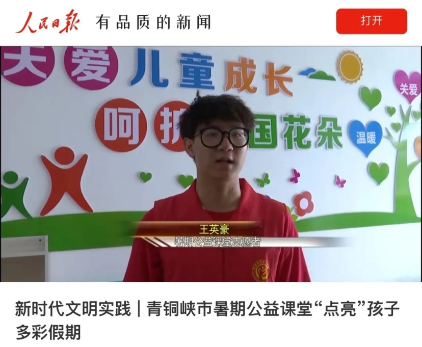 除了学校的各项事务外,王英豪还十分热心公益,他曾参加团中央青年志愿者行动指导中心、中国青年志愿者协会2023年“七彩假期”项目,作为pg娱乐电子游戏官网入口“志智双扶”七彩志愿服务队负责人带领团队圆满完成各项实践任务顺利结项。在这次公益活动中,王英豪带领团队在宁夏回族自治区为当地随迁子女、留守儿童开展为期十天的“青春追梦,一路童行”互动文化之旅。活动期间,团队公益课堂课程设置坚持教育性、知识性、趣味性相结合,围绕传统文化、亲情陪伴、素质拓展、思想引领、心理辅导等方面,开设了绘画、唱歌、舞蹈、红色故事、科技、书法、手工、户外运动等课程。不仅丰富了当地青少年的假期生活,有效解决困难家庭留守儿童假期看护照料难和学习生活单一等问题,还满足了青少年成长发展多元化需求,让孩子们度过一个更加充实有趣的暑假。