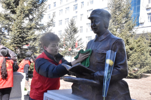 清风寄哀思,翠柏传敬意。在十大英模像前,志愿者们怀着对先烈的十分崇敬的心情,虔诚仔细地擦拭着每个塑像上的积尘,清扫枯枝落叶。清扫后,大家神情肃穆、整齐列队,集体默哀,向革命烈士敬献鲜花、行鞠躬礼,表达对牺牲烈士的深切追思,缅怀抗战英烈的不朽功绩。