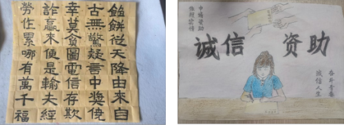 活动期间学院面向全体学生征集“诚信·感恩·励志”为主题的原创书画作品,同学们反响热烈,作品形式多样,经过综合评判分别评选出了1个一等奖,2个二等奖,3个三等奖。通过展现书画特长来增加学生在活动中的参与感、融合度;同时运用非宣讲惯用形式,在参观的过程中通过视觉记忆切实增强学生的诚信意识、金融意识、感恩意识。