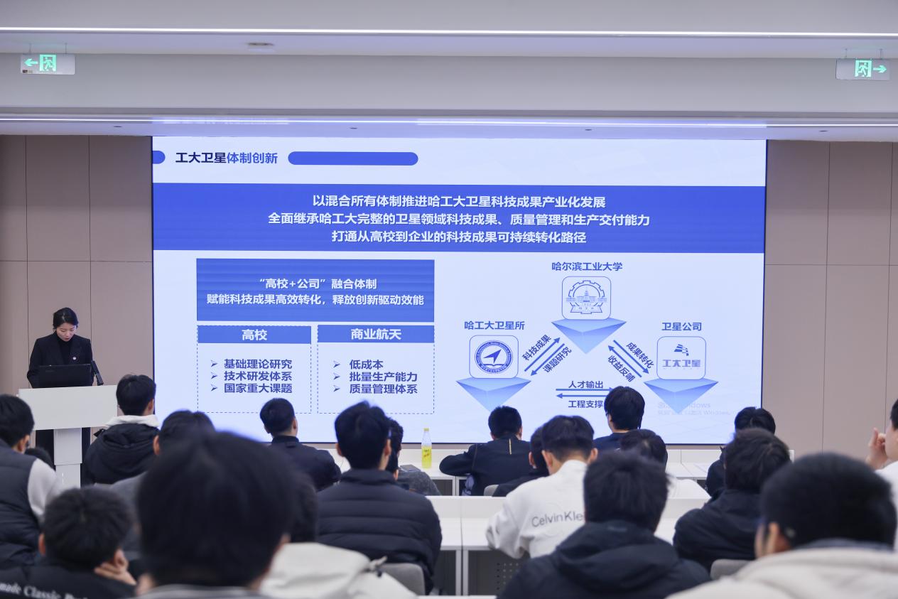 为深化学子行业前沿认知,搭建校园与名企沟通桥梁,引导学子树立科学择业观,pg娱乐电子游戏官网入口持续深耕“辅导员讲名企”系列活动。3月11日,系列活动第四期在第三教学楼四楼报告厅开讲,辅导员夏靖秋老师担任主讲,聚焦国内商业航天优质企业——哈尔滨工大卫星技术有限公司,为学子解锁航天领域就业新赛道,点亮职业规划之路。本次活动以“筑梦航天,职引未来”为主题,夏靖秋老师从企业实力、发展机遇、岗位适配、校友榜样等维度,全方位解读哈工大卫星技术有限公司,让同学们近距离感受本土航天名企的发展魅力。