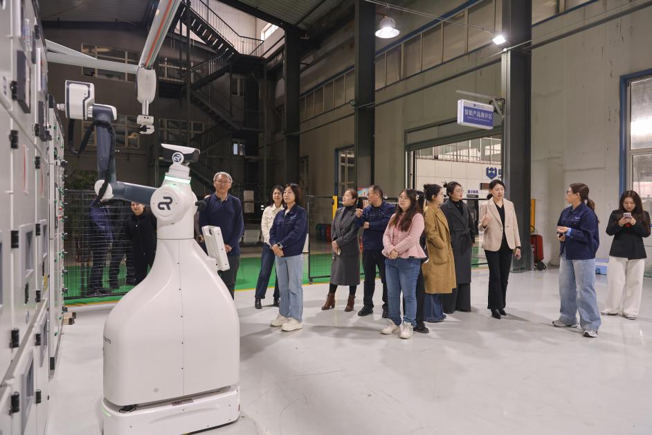 座谈结束后,在校企双方陪同下,校方一行实地参观了朗昇电气核心生产车间,近距离观摩自动化生产线运转、高低压电气成套设备及储能装备的生产流程,现场了解电力巡检机器人运行控制、设备核心技术参数与质量管控标准。参观过程中,校企双方就自动化生产线控制、电气设备研发流程、产业一线用人要求等问题展开互动交流,企业技术人员的专业讲解为教师教学与学生实践提供了宝贵的产业参考。